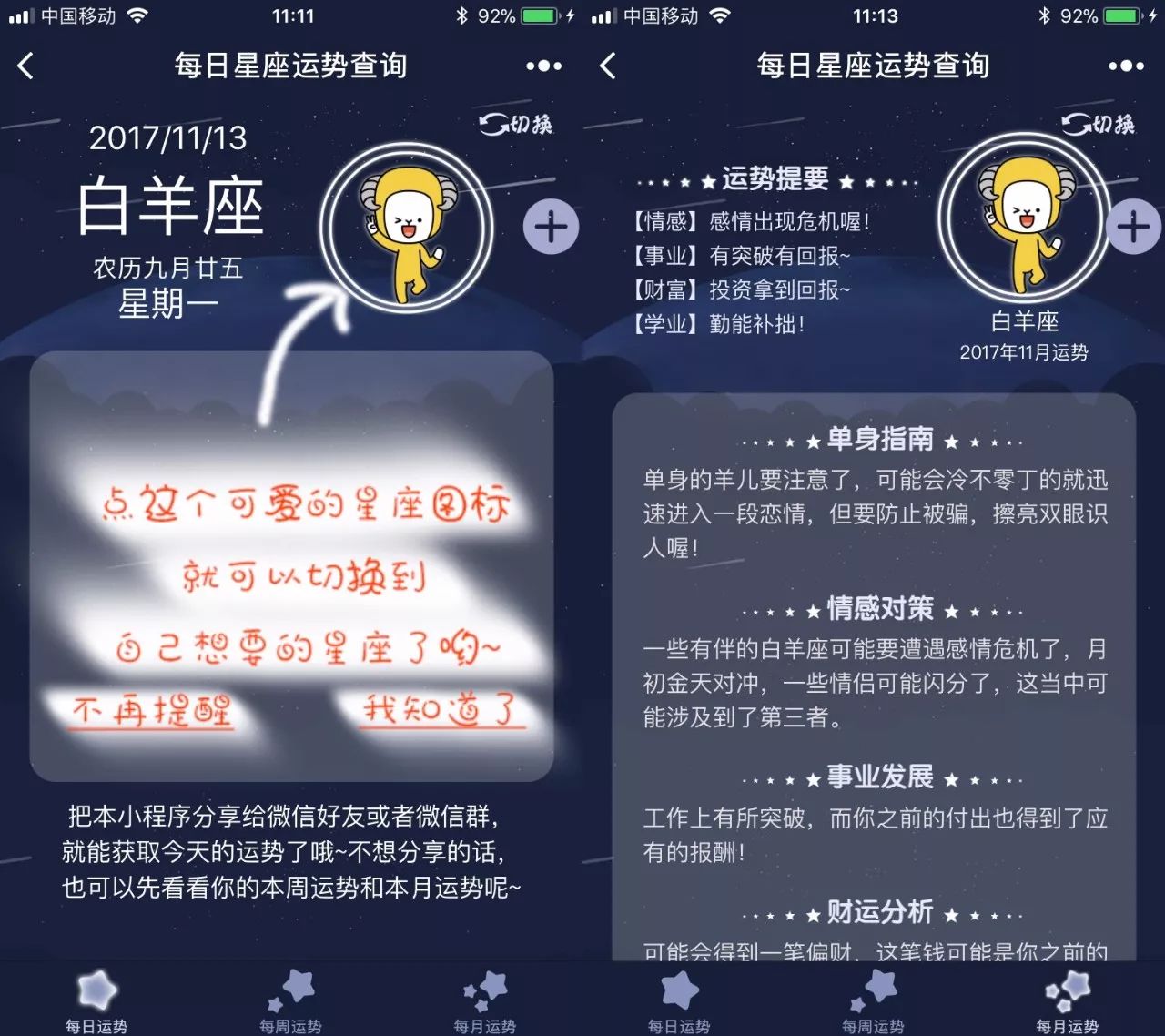 不过它有点“贱”的是,你要把小程序分享给别人才能看到今日运势,否则只能看到本周跟本月运势。