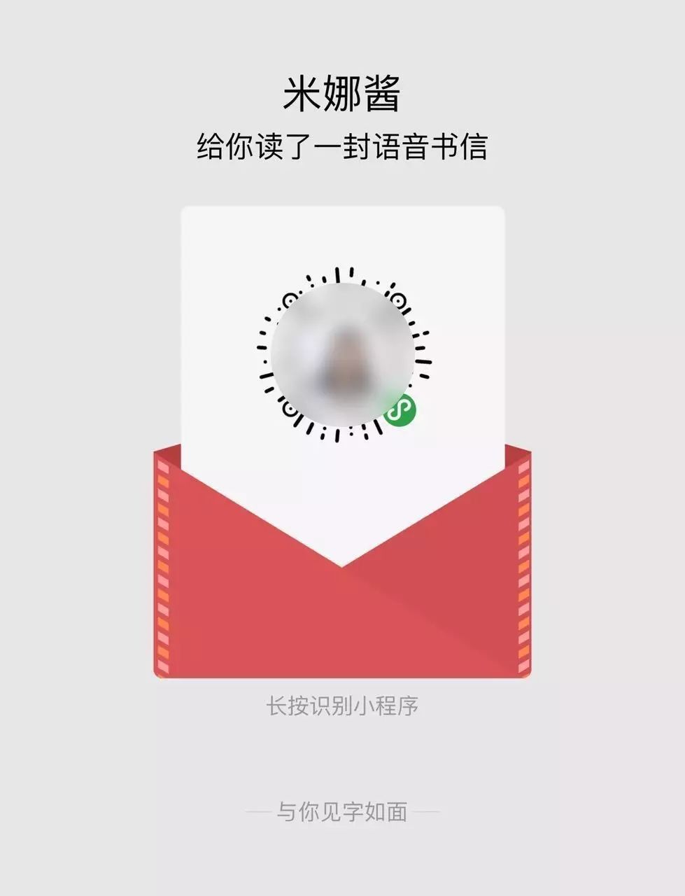 怎么活。每一句,每一词,每一字,放佛都蕴含了无穷无尽的故事,囊括了她生命中经历的种种。扑面而来的震撼和感动。这两句话已经不单单是十几个文字那么简单,它们带着写作者的感情,和朗读者的理解,深深地停留在了我的脑海。原来,这就是朗读的魅力。它能让每一个字,都绽放出情感的光彩;让每一个词,都沉淀出经年的故事。让听的人,也巴不得赶紧朗诵一首,以释放心中那份深藏已久的情感。送 Ta 一封有声的信一封书信,一封情谊。读信和写信最大的不同,也许就是声音中,总是饱含了读信人真挚的感情。光听,不过瘾。不如自己来录一封试试吧!点击下方的「寄一封」,就会弹出一个新的界面。 你可以点击上方的红色箭头,选「致朋友」、「给爱人」还是「给亲人」。 每一个模式,都为你提供了许多首内容相应的诗信,左右滑动即可选择。 如果你内心有特别的话,也可以选择「自定义信件」,只需在小程序中输入相应的「收信人」、「信内容」、「署名」即可。然后,你只需要点击「开始录音」,就可以开始你的表演啦!一信一码,社交新玩法录音完成之后,难道只能「孤芳自赏」吗?当然不是!「与你见字如面」提供了多种分享方式,让你能够方便地在微信上和好友交流。录完后,只需点击下方的「纸飞机」,你可以选择直接分享给微信好友,或者分享到微信群。 分享完后,在微信聊天框中就会出现一张精美的卡片,点击就能打开收听。如果你想让更多人听到你的大作,也可以选择「生成二维码卡片」,并将图片保存,然后就可以分享到朋友圈,让更多人听到你的「好声音」。